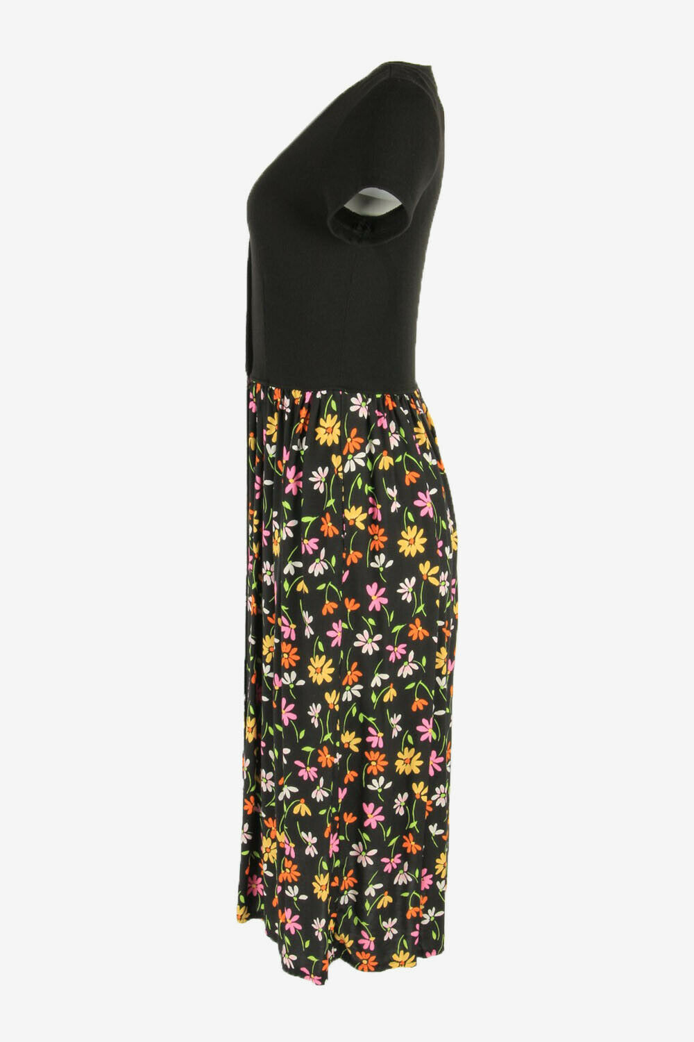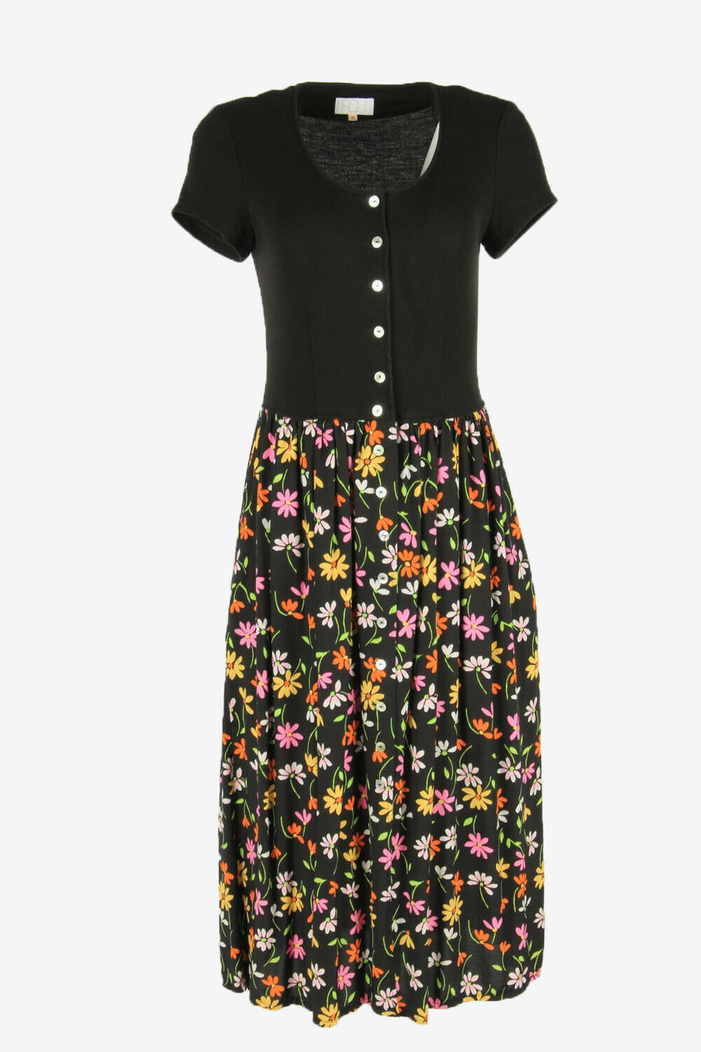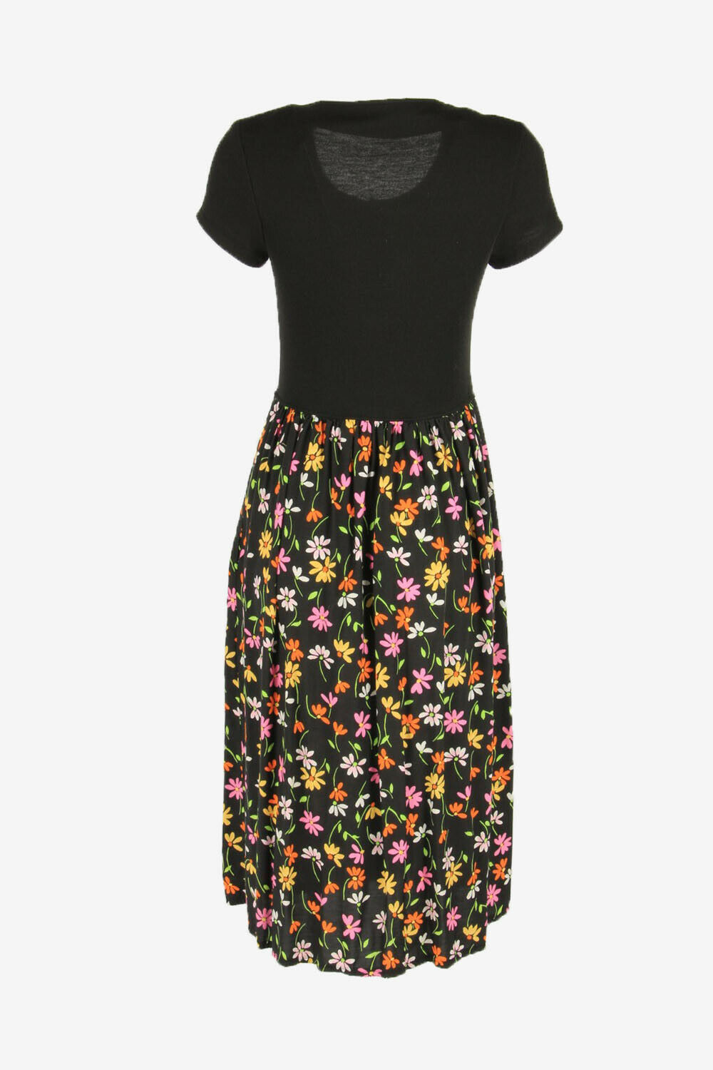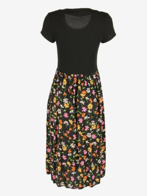 Floral Midi Short Sleeve Dress Scoop Neck 90s Black S
