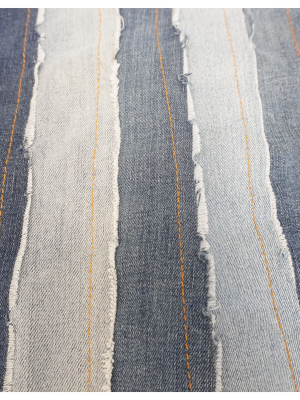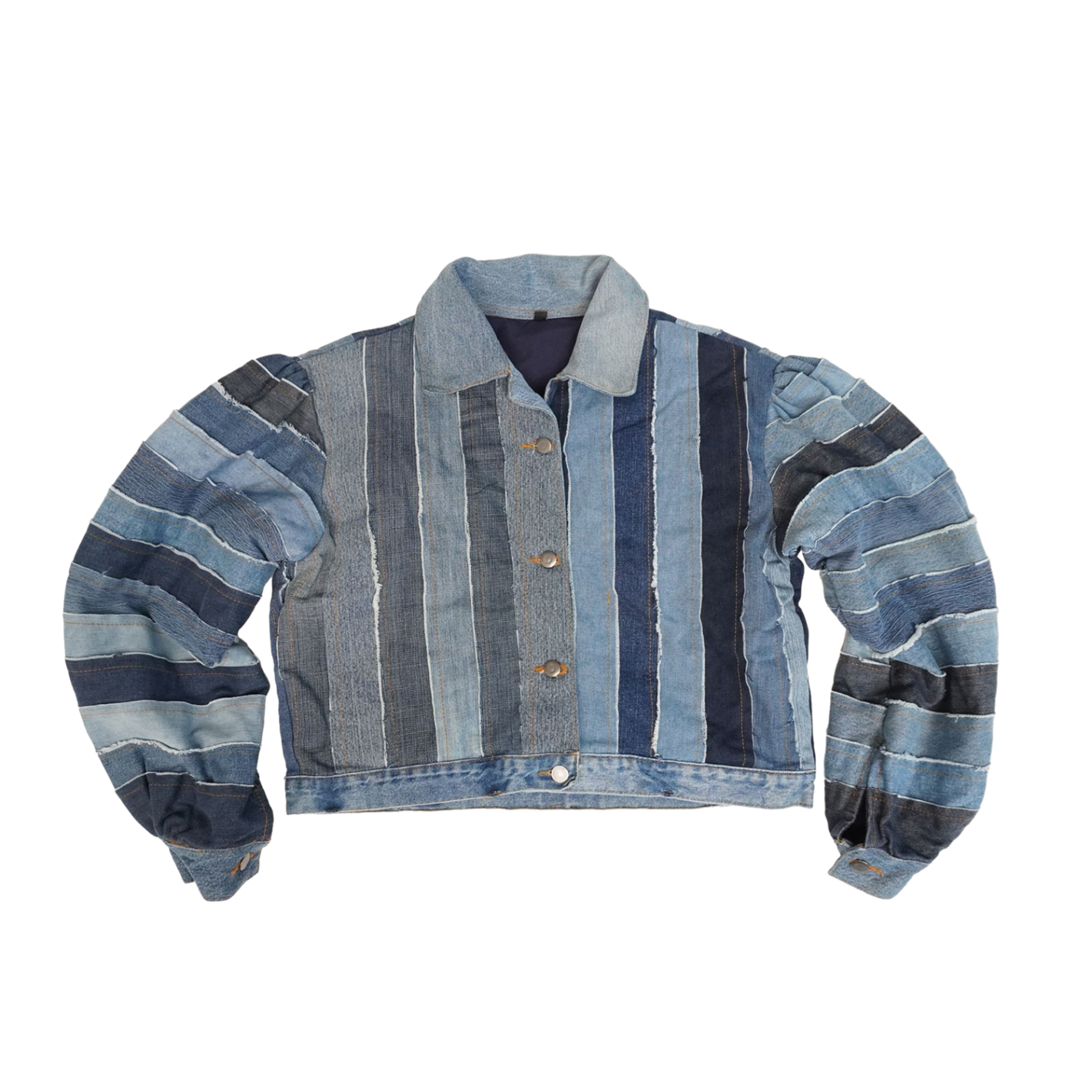 Featuring a short-cut, cropped silhouette and statement puff sleeves, it blends structured denim with soft, fashion-forward styling. The button-down front adds classic utility, while the multi-tone denim layers give it depth and texture.