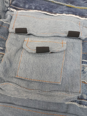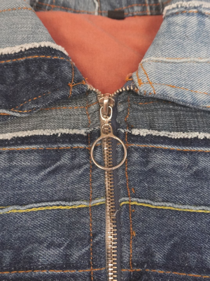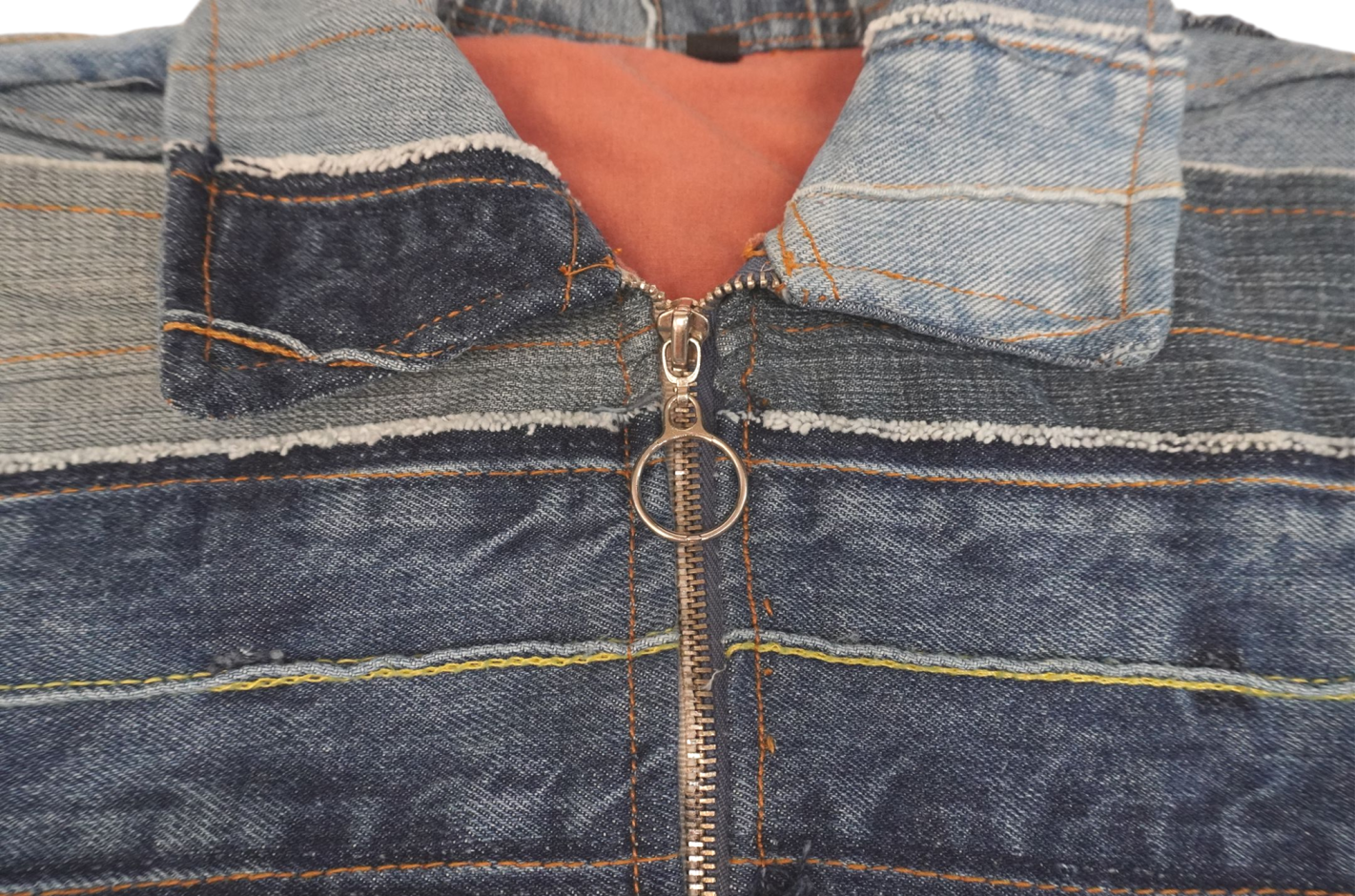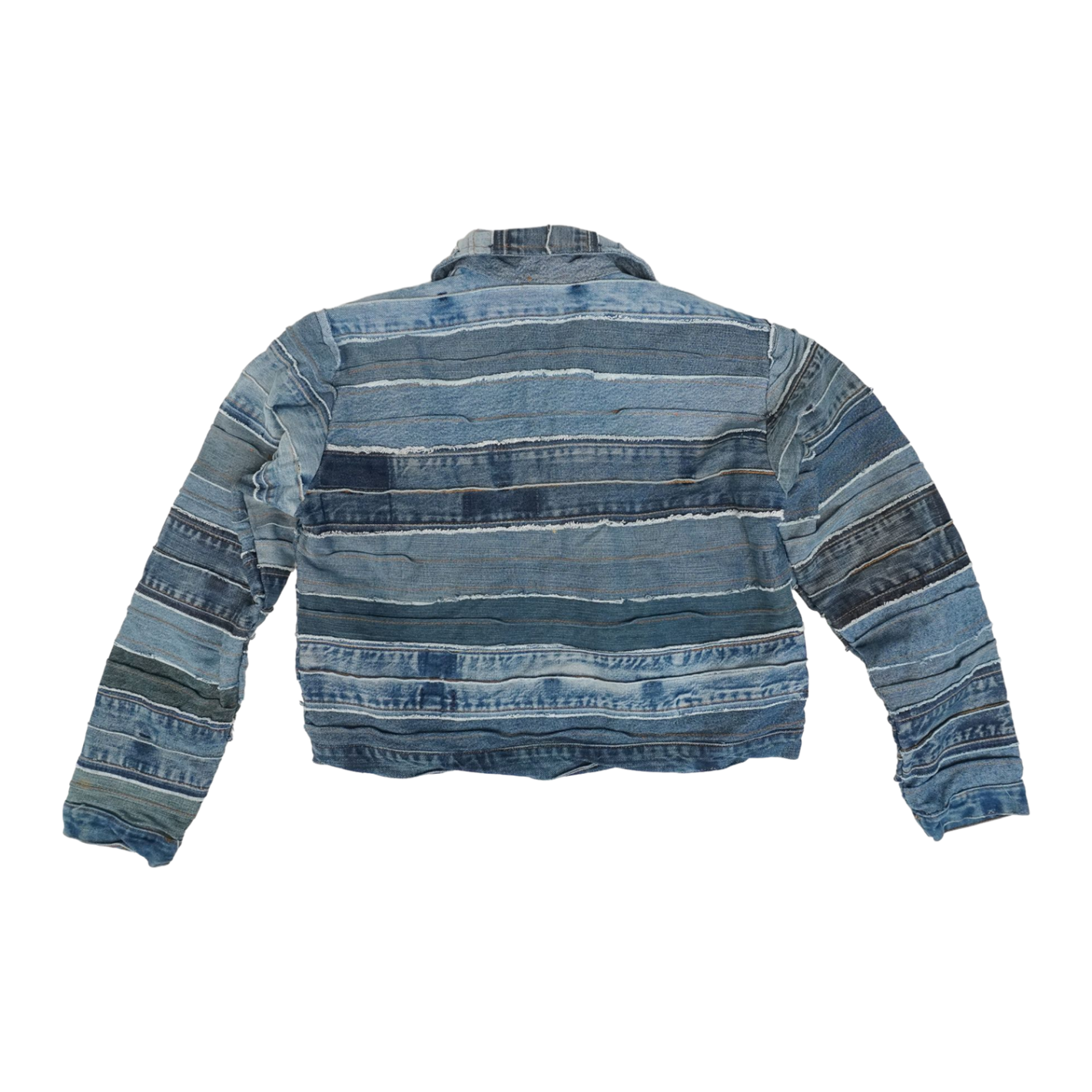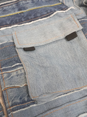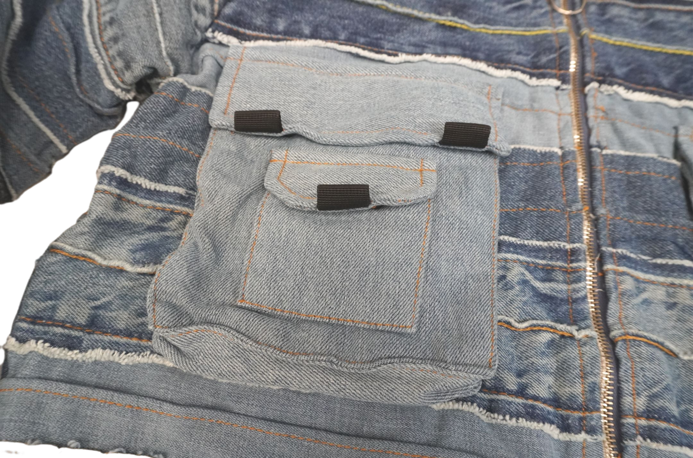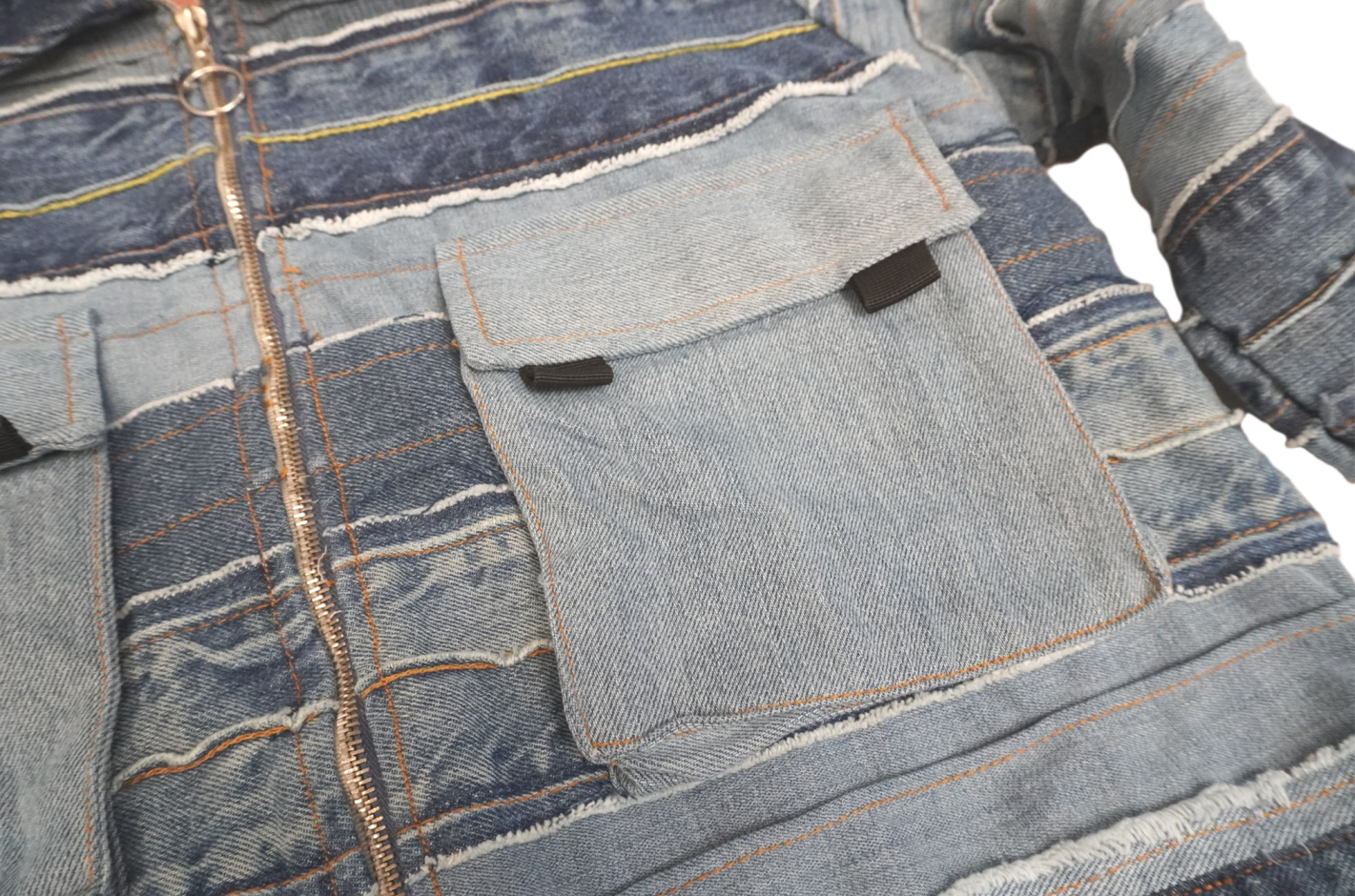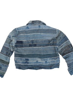 This one-of-a-kind denim artwork is crafted from recycled denim with exceptional attention to detail and craftsmanship. Featuring a Y2K-inspired cropped jacket silhouette, it showcases multiple layers of denim in varying shades of blue, creating a rich, textured look. The front is adorned with multiple chest pockets and unique stitching that adds bold character and individuality.