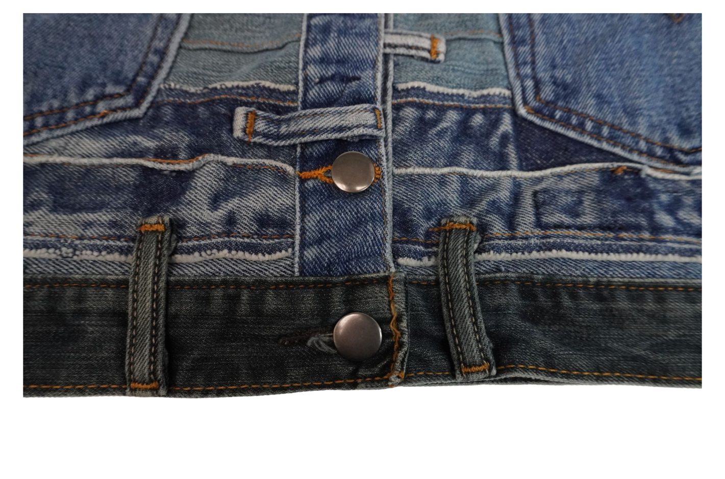 Crafted from recycled vintage jeans and denim products, this Stand Collar Remake Denim Jacket is a true testament to upcycled artistry. Featuring multiple shades of denim carefully layered and stitched together, each jacket is rich in texture and detail.