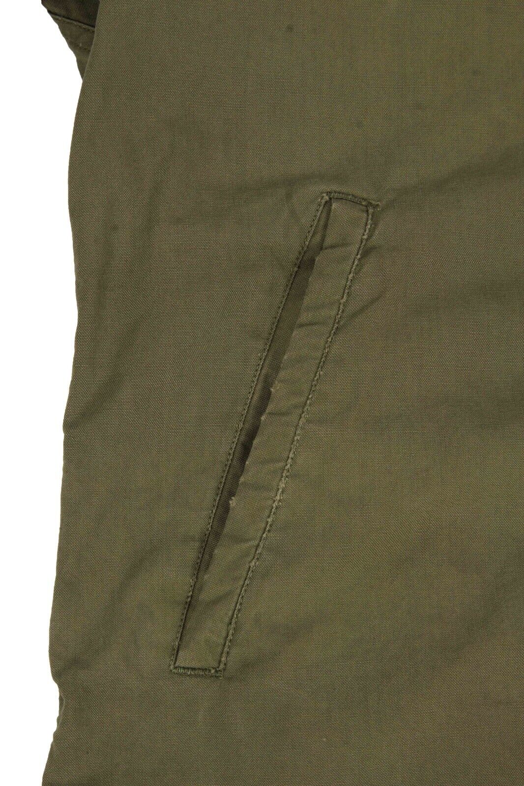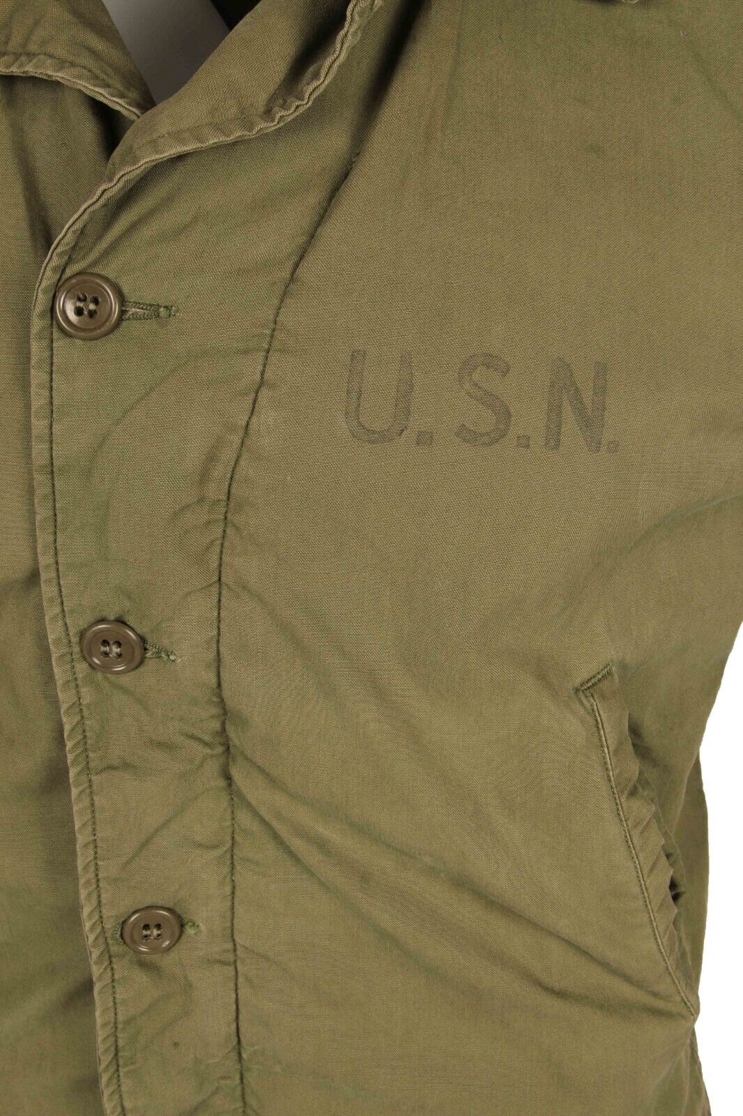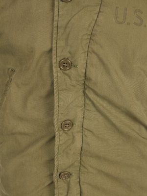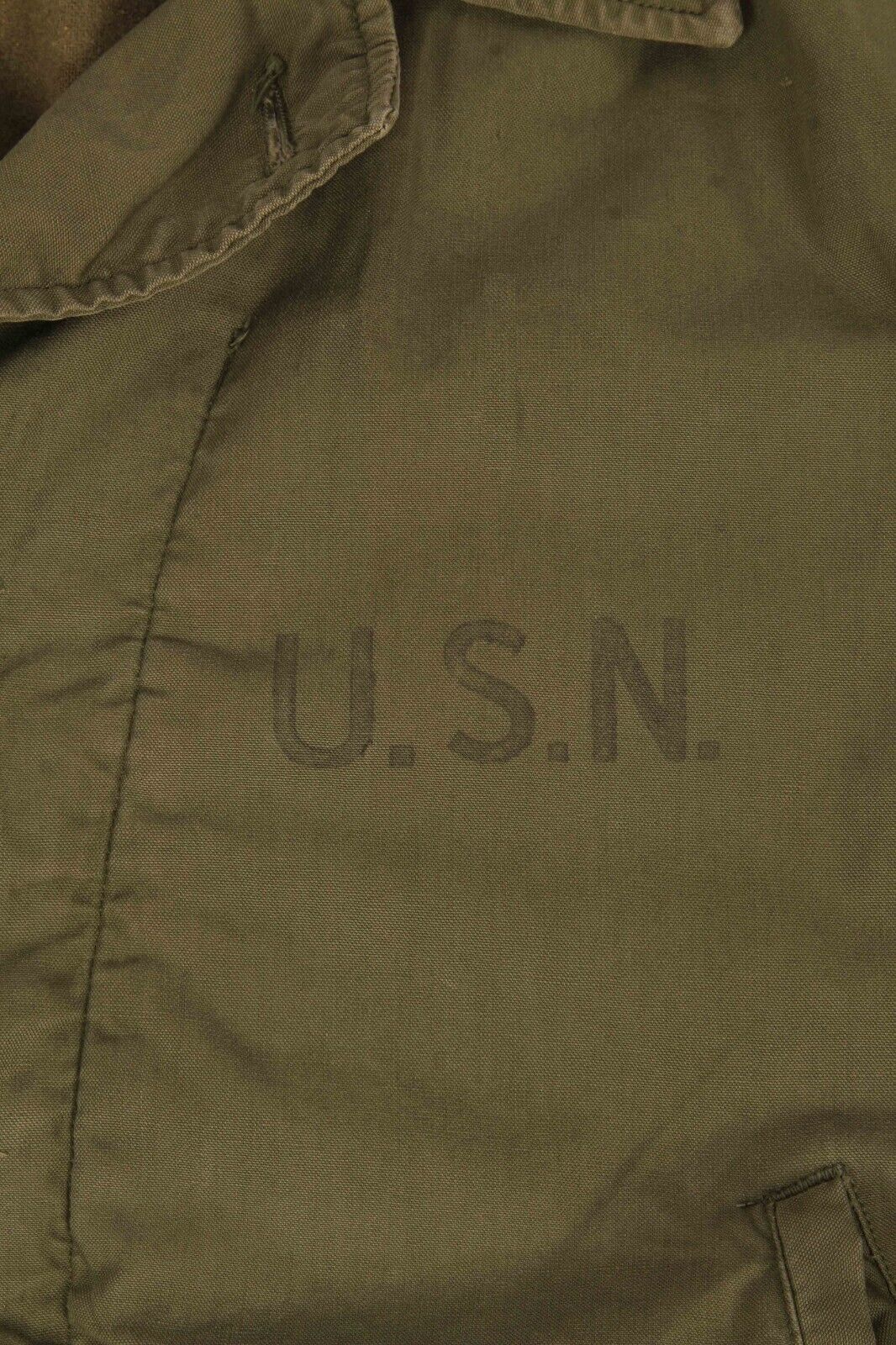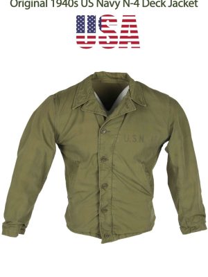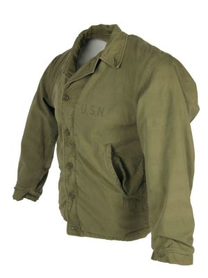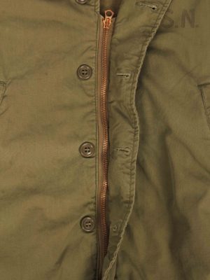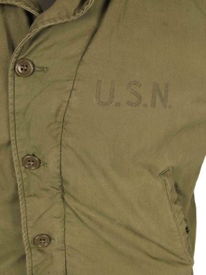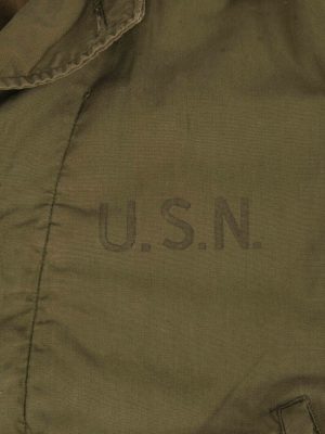 Officially referred to as the N4 Field jacket, this USN item closely resembles its Army counterpart, the M41. The main differences between the two are that the USN version is a darker green and does not feature epaulettes or the button tabs to the wrists. These jackets were made at the same time as the heavier N-4 Deck jackets but offered an intermediate weight option.