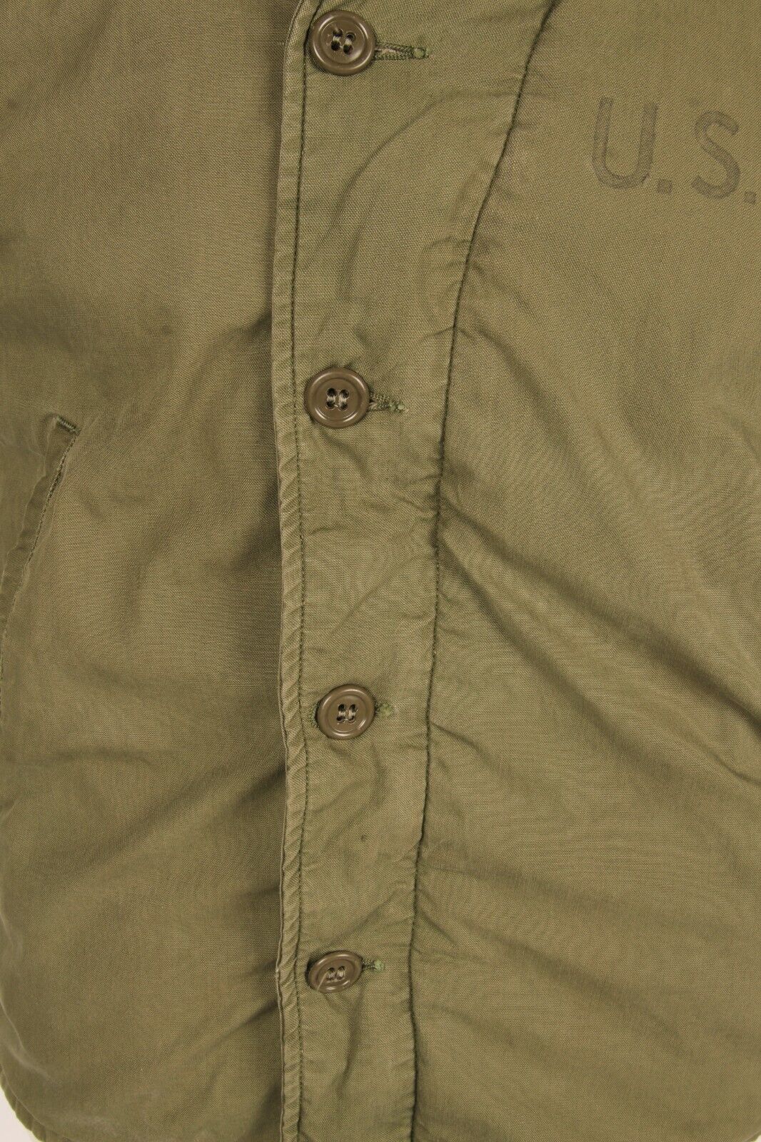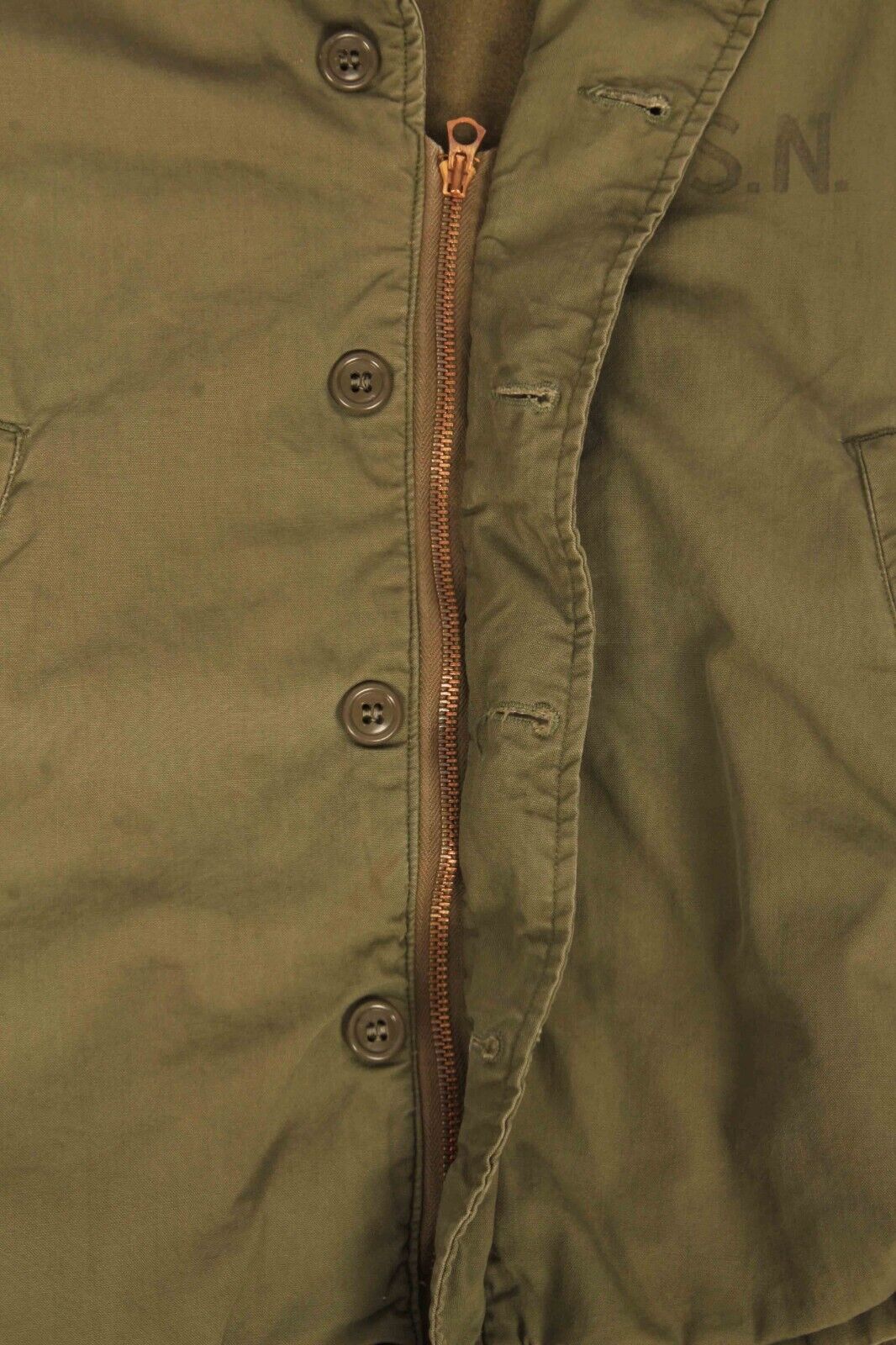 The front of the jacket features the standard ‘U.S.N’ stencil to the left breast which is still clear. Inside the jacket below the collar there is clear evidence of where the original contract label was stitched although it is sadly no longer present. This means it is impossible to date the jacket exactly but the material, buttons and zip date this to around the time of the Second World War.