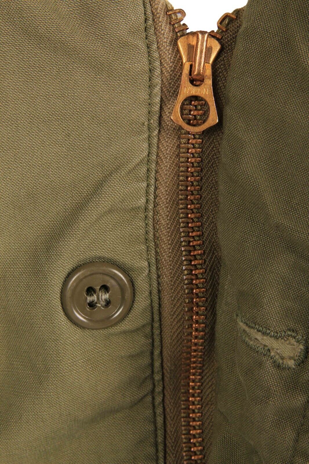 The jacket features a cotton shell and green coloured wool liner like its army counterpart. It features a brass ‘Talon’ branded zipper with bell shaped puller, typical of those found on US made military jackets of the 1940s. The zip is hidden behind a button fly which features 6 buttons whilst the is another button on the underside of the collar to allow it to be fastened around the neck.