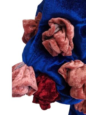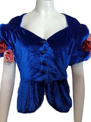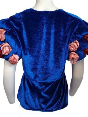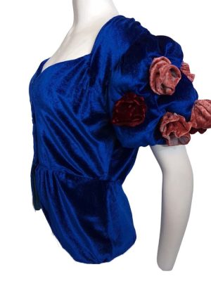 Vintage Velvet Top Puff Sleeve Button Up Peplum Blouse Royal Blue Size M